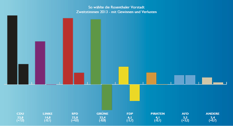 Die Linkspartei verlor um 0,5 Prozentpunkte auf 18,7% der Zweitstimmen im Wahlkreis, bleibt also ziemlich stabil, wenngleich bei den Erststimmen der Verlust von 19 auf 16,7% deutlicher ist.
